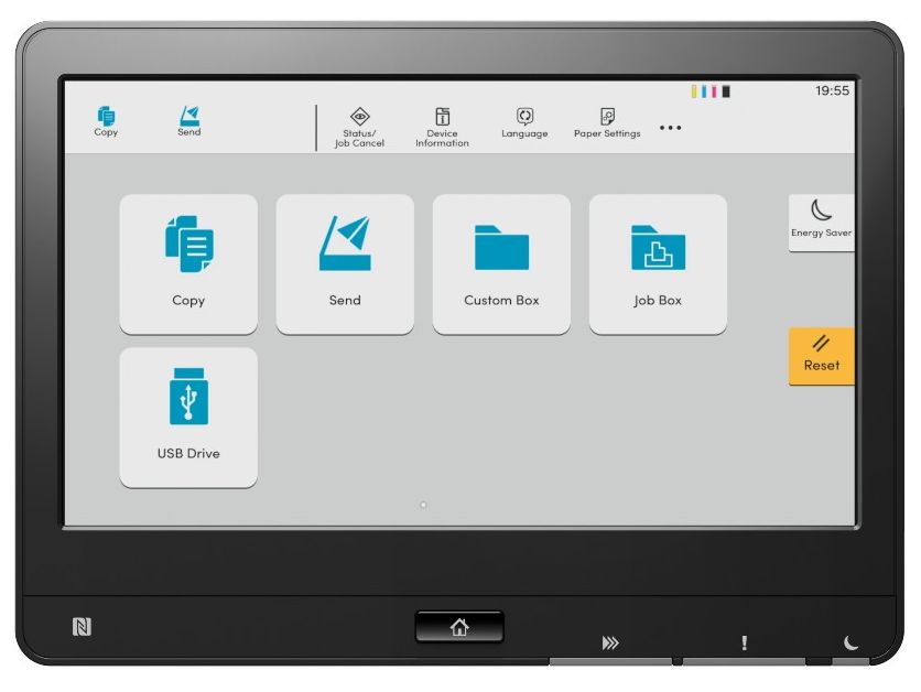 - Csatolók: USB 3.0 (Super-Speed USB), 4 x USB Host Interface, Gigabit Ethernet (10BaseT/100BaseTX/1000BaseT, IPv6, IPv4, IPSec, 802.3az support), opcionális Wi-Fi (IEEE 802.11b/g/n), 2 eKUIO slots for optional internal print server or for optional fax system, slot for optional Wireless LAN, Slot for optional SD Card, NFC tag