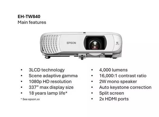 Epson EH-TW840 házimozi projektor, FHD, 2xHDMI, 4000 lumenCikkszám: EH-TW840 Gyártói cikkszám: V11HB63040 Garancia: 3 év Szállítás: Elérhető Üzletünkben vagy a beszállítónk raktárában polcon található termék.