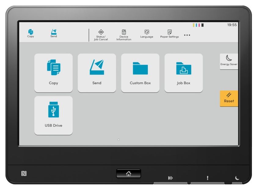 - Csatolók: USB 3.0 (Super-Speed USB), 4 x USB Host Interface, Gigabit Ethernet (10BaseT/100BaseTX/1000BaseT, IPv6, IPv4, IPSec, 802.3az support), opcionális Wi-Fi (IEEE 802.11b/g/n), 2 eKUIO slots for optional internal print server or for optional fax system, slot for optional Wireless LAN, Slot for optional SD Card, NFC tag