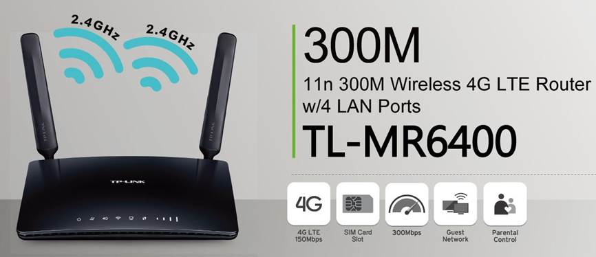 TP-LINK TL-MR6400 300Mbps Wireless N 4G LTE RouterCikkszám: TL-MR6400 Garancia: 3 év Szállítás: Elérhető Üzletünkben vagy a beszállítónk raktárában polcon található termék.
